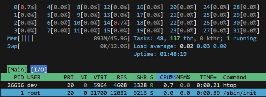 Only 50% of our host’s 96GB RAM is available to WSL under “Mem”, along with a 12GB swap file. This will become important later.