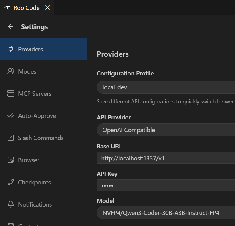 docker compose --profile dev --env-file codebase-indexing/.env upRoo Code profile settings for this configuration:
