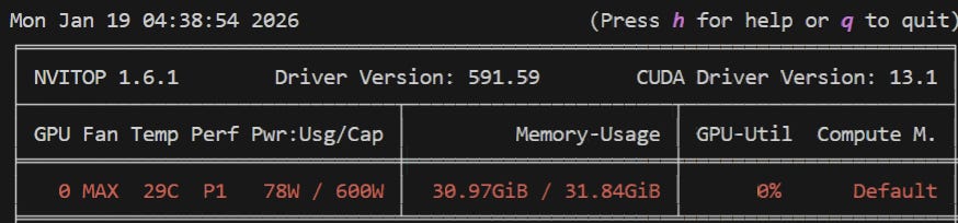 Next up, make sure that whatever you’re running on the host is consuming less than 2.5GB VRAM by running nvitop. If you don’t have ten billion tabs of 4K videos open because it’s 5am and you ended up in the weird part of YouTube, you should be good.